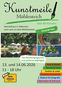 Am 13. und 14. Juni 2026 verwandelt sich das Gelände rund um den Mühlenteich in ein lebendiges Atelier. Talentierte Künstlerinnen und Künstler präsentieren nicht nur ihre Werke, sondern lassen Sie unter freiem Himmel an ihren kreativen Momenten teilhaben. Spüren Sie die inspirierende Atmosphäre, kommen Sie ins Gespräch mit den Kunstschaffenden und entdecken Sie Werke, die Geschichten erzählen.